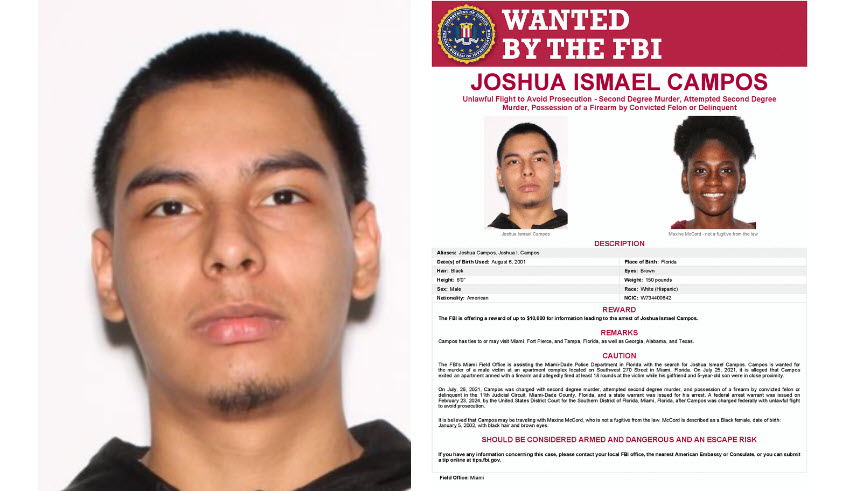 The FBI has announced a substantial reward of up to ten thousand dollars for any information leading to the capture of Joshua Campos, a fugitive wanted in connection with a murder case in Southwest Miami-Dade. Campos is believed to have fled to Texas, Georgia, or Alabama, nearly three years after the fatal shooting of a young father outside an apartment complex.