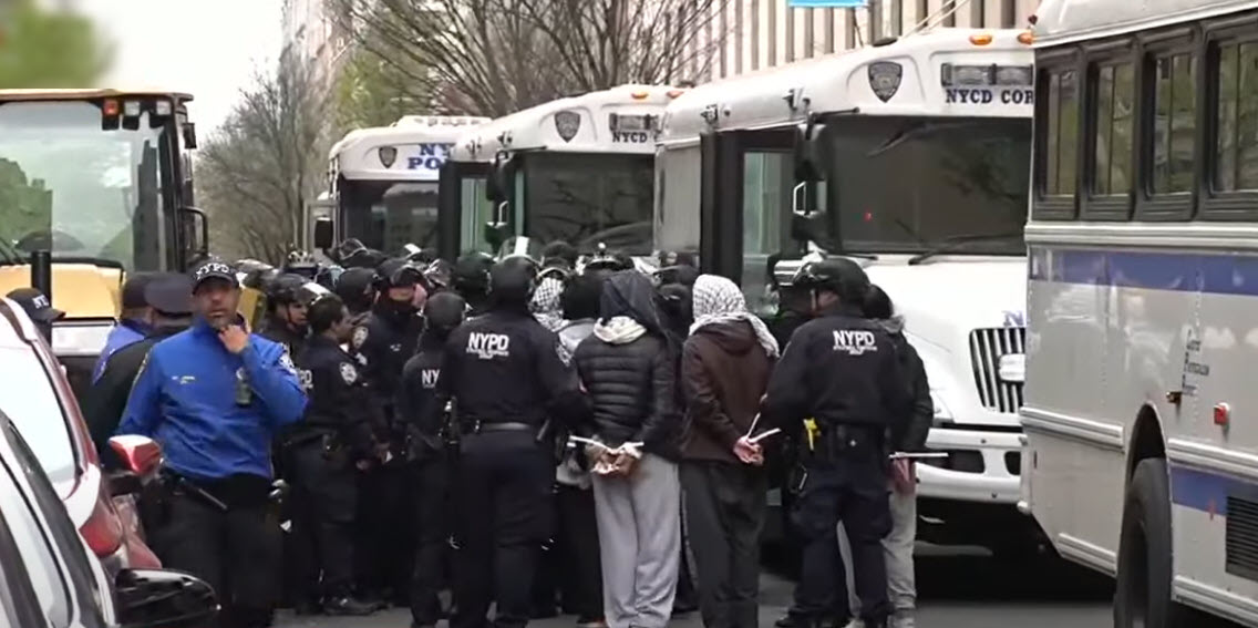 Videos and reports from the scene depict a significant police presence, with officers in riot gear working to dismantle the protest camp and arrest individuals for trespassing. Protesters are being escorted onto large NYPD buses as part of the clearing process.
