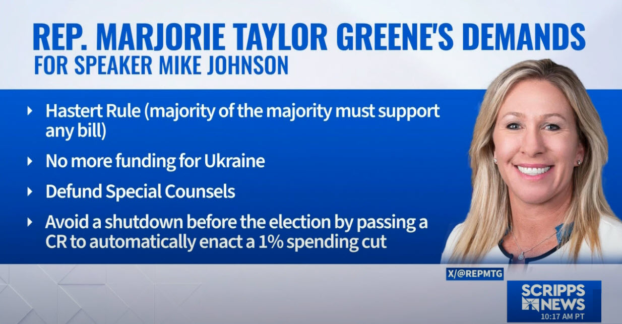 Today, Greene and Johnson are scheduled for a pivotal meeting that is not expected to yield negotiations but will be crucial for discussing the potential upcoming vote. Johnson remains firm that the meeting is not for negotiation purposes. This confrontation follows Greene’s demands outlined earlier, including halting further aid to Ukraine, defunding the special counsel probes into Donald Trump, and reinstating the Hastert Rule, which prohibits bringing legislation to a vote without a majority support from the House majority.