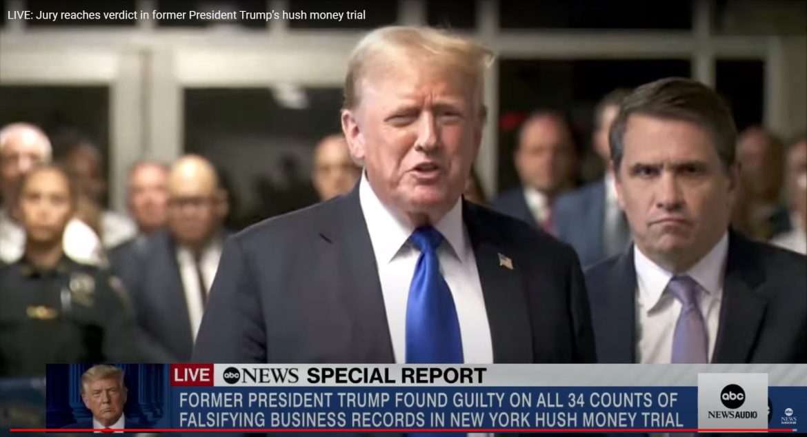 Donald Trump is the first American President to stand trial and be found guilty in a criminal case. The former President spoke after the verdict was read. The New York jury has found him guilty on all counts in his hush money case. He could face four years in prison depending on the judge’s sentence, which will happen later. The judge has the discretion to reduce his sentence to a fine, probation or supervision. He is guilty of falsifying records before the 2016 election to hide payments to adult film star Stormy Daniels.