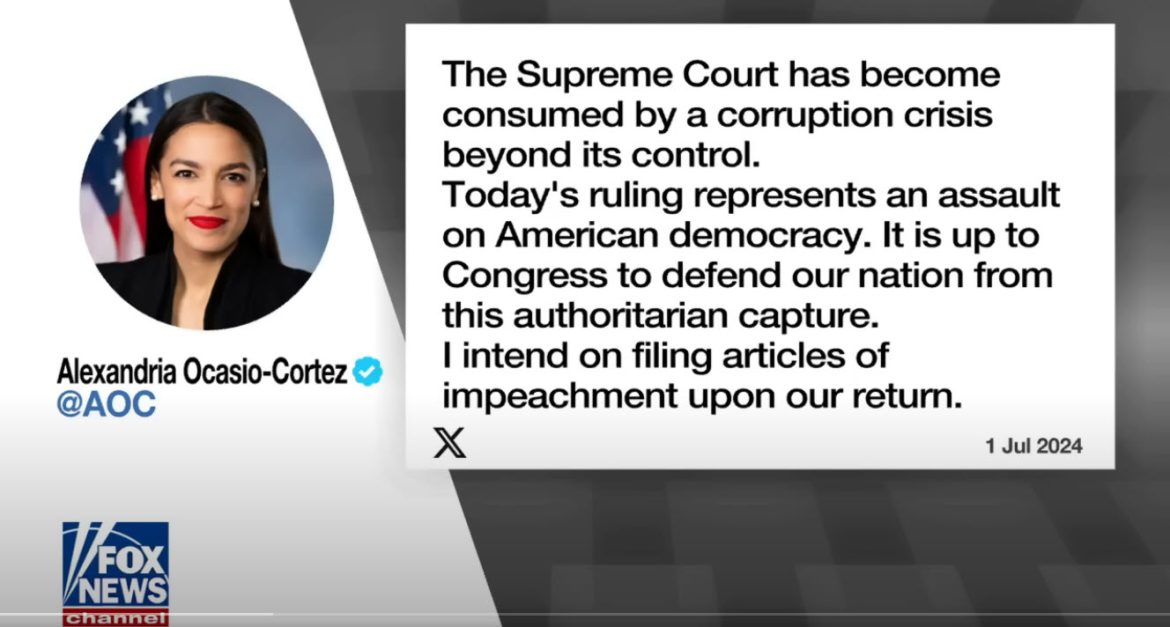 Representative Alexandria Ocasio-Cortez (D-NY) vows to file impeachment articles against at least one Supreme Court justice following the Court’s recent decision to grant presidential immunity for official acts. The ruling, which has significant implications for former President Donald Trump’s federal election interference case, has drawn sharp criticism from Democratic leaders.