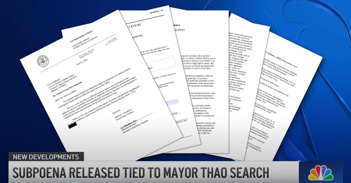 A newly released subpoena is shedding light on an ongoing federal grand jury investigation connected to Oakland Mayor Sheng Thao. The U.S. Attorney’s Office has issued a sweeping subpoena that covers all employees at Oakland City Hall and demands records related to several entities and the 2022 mayoral election.