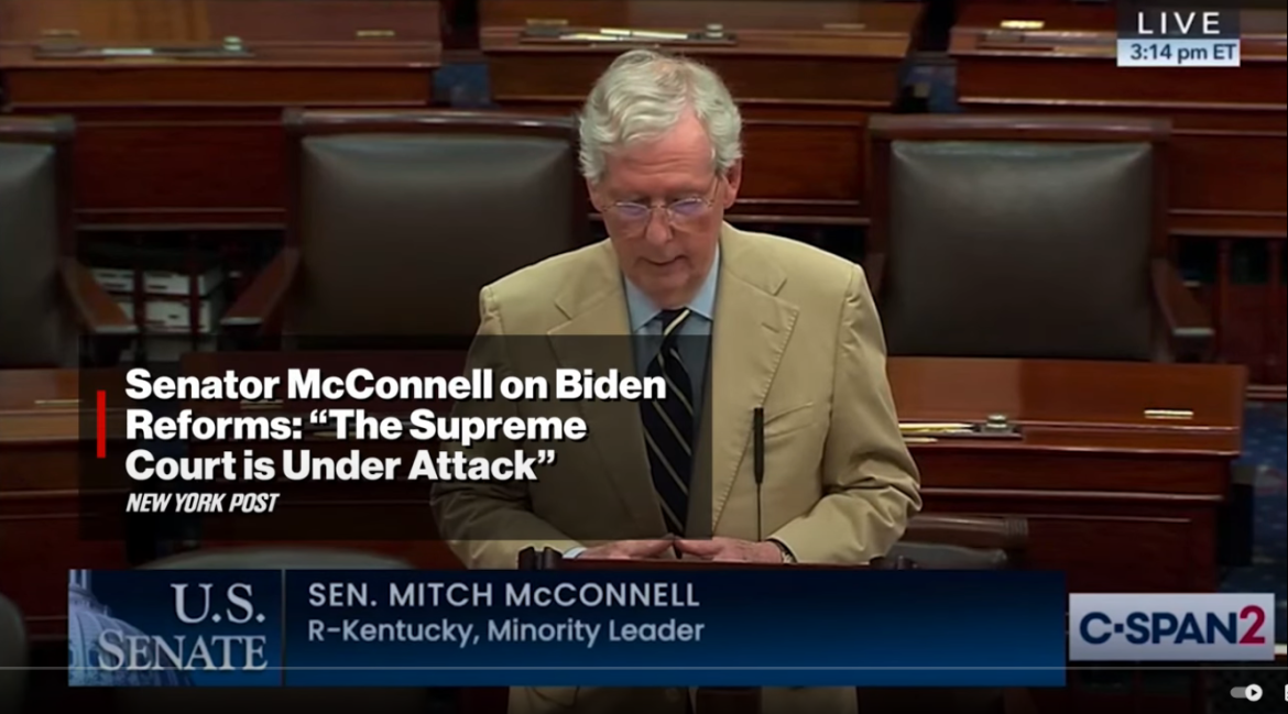 Senate Minority Leader Mitch McConnell is vehemently condemning President Biden’s proposed reforms to the Supreme Court, likening them to the January 2021 attack on the U.S. Capitol. In an interview with Punchbowl News, McConnell argues that Biden’s efforts are aimed at “trying to break the system.”