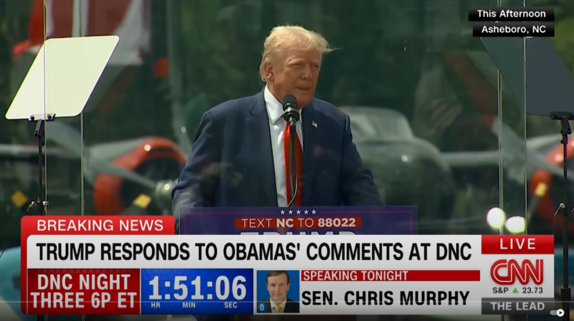 Former President Donald Trump is pushing back against the Obamas’ sharp criticism delivered during their speeches at the Democratic National Convention (DNC) last night. Speaking at a rally in Asheboro, North Carolina, today, Trump addressed the remarks made by former President Barack Obama and former First Lady Michelle Obama, both of whom took pointed jabs at Trump’s tenure and his ongoing presidential campaign.