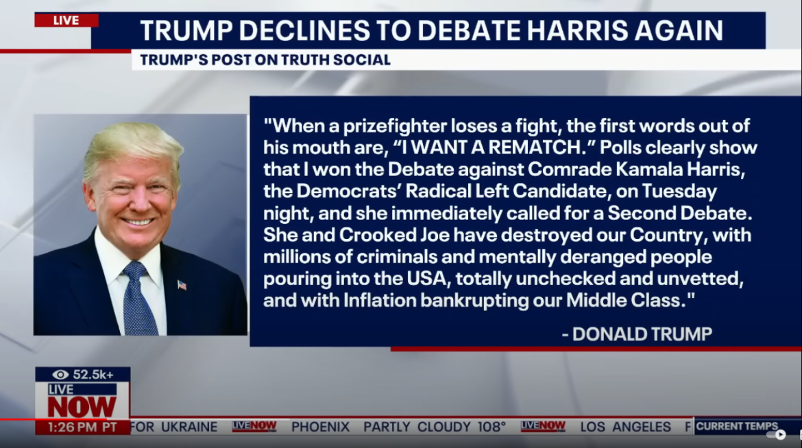 Former President Donald Trump announced via a post on Truth Social that there will not be another debate with Vice President Kamala Harris, dismissing her calls for a second showdown as unnecessary. Trump declared that polls showed him as the clear winner in their recent debate and suggested Harris’s request for another debate was an indication that she lost.