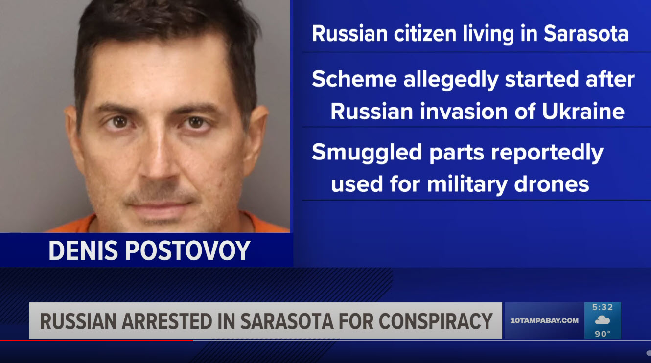 A Russian national residing in the Tampa Bay area has been arrested and charged with conspiring to defraud the United States by illegally exporting technology used in military drones. The Department of Justice (DOJ) announced that 44-year-old Denis Postovoy was apprehended in Sarasota for his alleged involvement in a scheme to smuggle sensitive technology to Russia through a complex network of companies he operates.