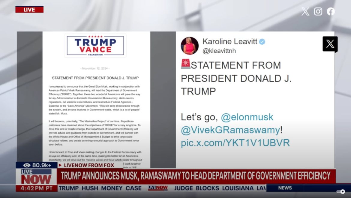 President-elect Donald Trump has named billionaire Elon Musk and former presidential candidate Vivek Ramaswamy to lead the newly established Department of Government Efficiency, a role aimed at overhauling federal bureaucracy and restructuring government agencies. Trump’s appointment of Musk, CEO of Tesla and social media platform X (formerly Twitter), and Ramaswamy, an entrepreneur and political newcomer, signals a bold approach to slashing government inefficiency, a hallmark of Trump’s campaign promises. This move, however, is already drawing mixed reactions within Trump’s inner circle and sparking media speculation.