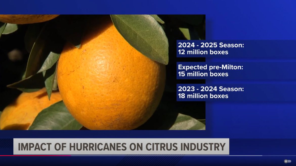 Florida’s citrus industry is bracing for a historic low in production, with recent damage from Hurricane Milton exacerbating an already challenging season. According to an updated forecast from the U.S. Department of Agriculture (USDA), orange production is projected to drop to just 12 million 90-pound boxes for the current growing season. This figure is 3 million fewer boxes than estimates before Hurricane Milton struck and significantly lower than the 17.96 million boxes produced during the 2023-2024 season, which ended in July.