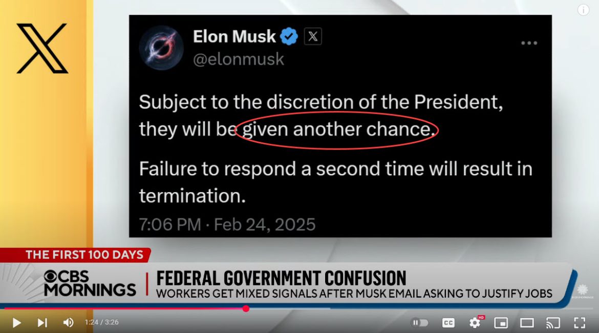 Following the initial deadline, Musk announces on X that, subject to the President’s discretion, employees who fail to respond will be given a second chance. He reiterates that non-compliance after this extension will result in termination. President Trump supports Musk’s initiative, stating that employees who do not comply will be “semi-fired or fired.”