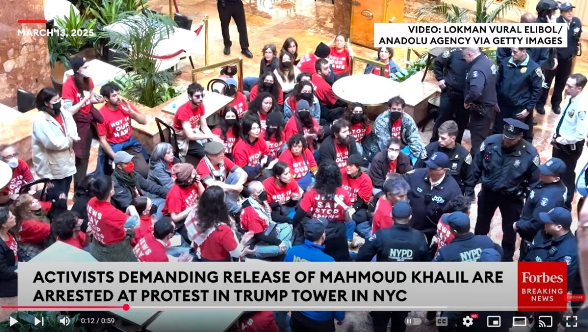 A large group of pro-Palestinian protesters flooded Trump Tower in New York City on Thursday, demanding the release of detained activist Mahmoud Khalil. The demonstration, organized by Jewish Voice for Peace, saw at least 100 protesters occupy the building’s dining area, chanting and holding signs in support of Khalil, a former Columbia University student who was arrested last weekend during another protest.