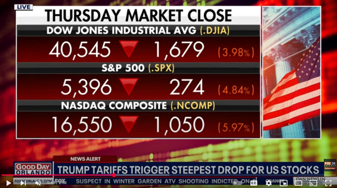Stocks continue their sharp descent for a second consecutive day as President Donald Trump’s sweeping global tariff announcement sends shockwaves through international markets and stokes fears of a looming U.S. recession. The Dow Jones Industrial Average plunges by over 2,000 points in midday trading, marking one of the steepest two-day declines in recent memory. The Nasdaq Composite and S&P 500 also spiral downward, each losing more than five percent at various points Friday.